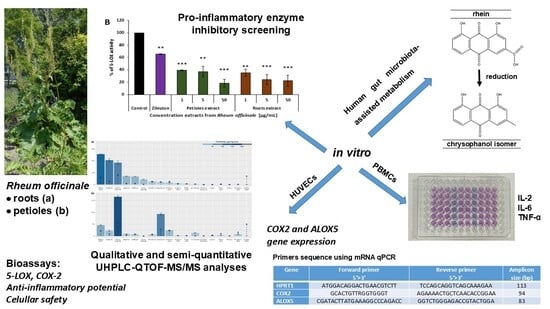 Background/Objectives: Rheum officinale, an ethnomedicinal plant, has roots widely employed in modern pharmacological formulations. However, many of its biological activities remain only partly recognized. Furthermore, the metabolome and biological activity of its edible petioles, often considered a waste product, have received limited scientific attention. Methods and Results: The examination of anti-inflammatory properties of both root and petiole extracts (1–50 µg/mL) revealed the inhibition of the pro-inflammatory cytokine release from human peripheral blood mononuclear cells, a reduction in ALOX5 gene expression in human umbilical vein endothelial cells, and the significant inhibition (>60%) of cyclooxygenase-2 and 5-lipoxygenase activities. Importantly, no cytotoxic effects were detected at the tested concentrations. Conclusions: The petiole extract demonstrated anti-inflammatory efficiency comparable to, or exceeding that of the root extract, suggesting that R. officinale petioles could be valuable source of bioactive compounds for future investigations.