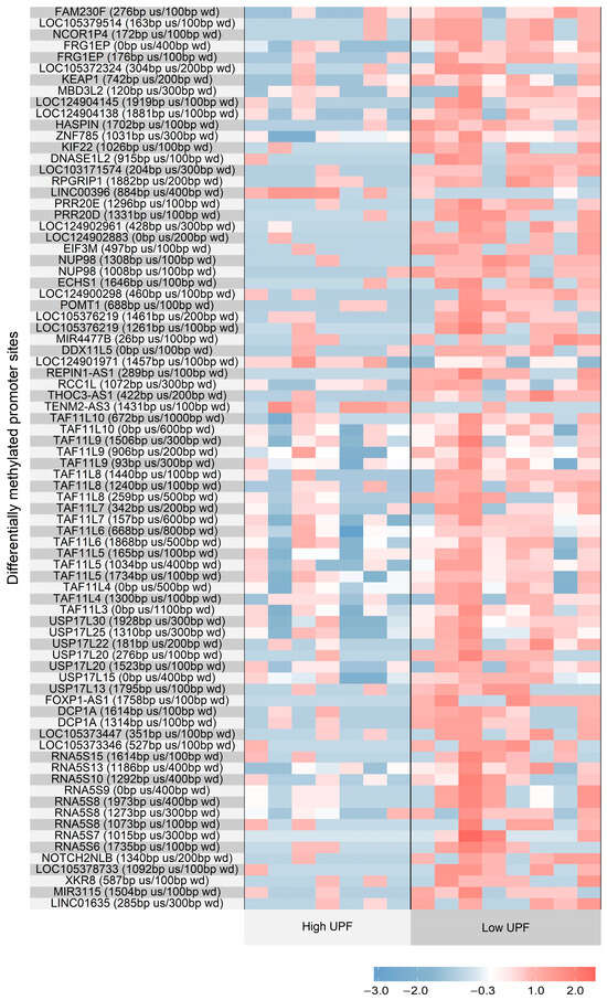 Background/Objectives: The global increase in the consumption of ultra-processed foods (UPFs) parallels the rise in obesity and non-communicable chronic diseases. Although several large-scale studies associate UPF intake with adverse health outcomes, the biological mechanisms remain unclear. Epigenetic alterations, such as changes in DNA methylation, may represent a potential pathway by which diet influences metabolic health. The aim of this study was to investigate whether higher UPF consumption is associated with genome-wide DNA methylation patterns in women. Methods: This was a cross-sectional observational study with exploratory epigenetic analysis. We selected 30 women, who were divided into tertiles based on their UPF consumption (expressed as a percentage of total energy intake) according to the NOVA food classification system. Dietary intake was assessed using a three-day food record. Anthropometric data, body composition and laboratory parameters were evaluated. The analysis of DNA methylation was performed utilizing DNA extracted from peripheral blood leukocytes of participants in the first and third tertiles of UPF consumption. Genome-wide methylation patterns were performed using next-generation sequencing. Results: Participants had a median (IQR) age of 31 years (26.0–36.5) and a BMI of 24.7 (23.6–35.8) kg/m2. For the epigenetic analyses, 15 women were included. Of the 30 women initially evaluated, 20 were included as they belonged to the first and third tertile of UPF consumption. Of these, five were excluded due to a low number of reads obtained by NGS. A total of 80 differentially methylated regions were identified between groups, most of which were hypomethylated in the high-UPF-intake group. Conclusions: High UPF consumption was associated with altered DNA methylation patterns, suggesting a potential epigenetic mechanism underlying the negative health effects of UPFs. This pilot study provides a model for future research with larger samples.