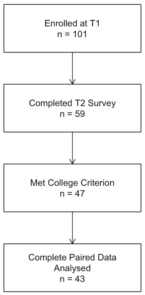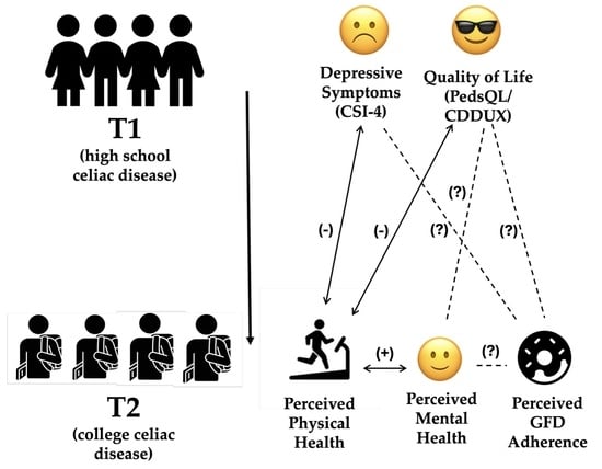 Background/Objectives: To determine whether adolescent (T1) mental health, quality of life, and adjustment to celiac disease (CeD) are associated with college-age (T2) perceived physical and mental health and gluten-free diet (GFD) adherence. Methods: In 2015, adolescents with CeD (n = 101, T1)