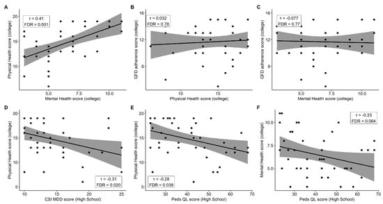Background/Objectives: To determine whether adolescent (T1) mental health, quality of life, and adjustment to celiac disease (CeD) are associated with college-age (T2) perceived physical and mental health and gluten-free diet (GFD) adherence. Methods: In 2015, adolescents with CeD (n = 101, T1) completed standardized surveys assessing mental health (CSI-4), quality of life (PedsQL), and adjustment to CeD (CDDUX). Five years later, participants ≥18 years self-reported GFD adherence and physical and mental health perception in college (n = 59, T2). Patients who were current or recent college students that provided complete data at both time points were analyzed (n = 43) using Kendall’s tau to test: concurrent associations among T2 perceived physical/mental health and GFD adherence; and prospective associations between T1 measures and T2 perceived outcomes. Results: Higher T1 CSI-4 and PedsQL scores were negatively correlated with T2 perceived physical health (τ = −0.31, p = 0.02 and τ = −0.28, p = 0.04, respectively). There was trending association between T1 PedsQL and T2 mental health perception (τ = −0.23, p = 0.06). T2 physical and mental health perception were positively correlated (τ = 0.41, p = 0.001). No significant associations emerged between T1 measures and T2 GFD adherence, nor between T2 health perception and GFD adherence, although T2 physical health perception positively trended with GFD adherence (p = 0.78). Conclusions: Adolescents with CeD reporting more depressive symptoms or lower quality of life feel less physically and mentally healthy when in college. In college, feeling physically healthy aligns with feeling mentally healthy, although neither clearly predicts GFD adherence. Early mental health screening in adolescents with CeD may support transitions to independent dietary management.
