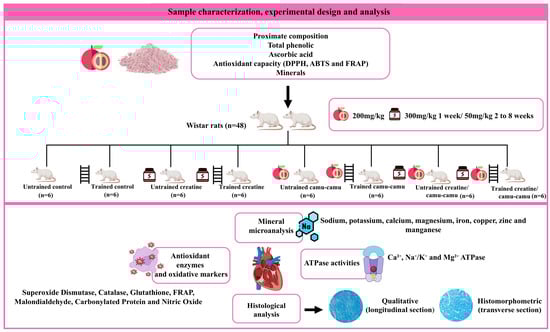 Background: Resistance exercise (RE) is recognized for promoting the development of muscle strength and mass, as well as contributing positively to cardiovascular health. The combination of this type of exercise with the intake of foods rich in bioactive compounds, such as camu-camu (Myrciaria dubia), and creatine supplementation may be an interesting strategy to enhance the cardiovascular system. Objective: This study aimed to evaluate the effects of RE and supplementation with camu-camu and creatine on oxidative balance, mineral content, ATPase enzyme activity, and histological changes in the heart of Wistar rats. Methods: Forty-eight adult rats were divided into eight groups, with or without RE. The groups received a control diet (AIN-93M), camu-camu (200 mg/kg/day), creatine (300 mg/kg for 7 days and 50 mg/kg/day thereafter), or a combination of both. The RE protocol was performed on a vertical ladder three times a week for eight weeks. At the end, the animals were anesthetized and euthanized for tissue collection. Results: The trained control group that received a standard diet (AIN-T) showed greater activity of superoxide dismutase and catalase. The trained group receiving creatine and camu-camu supplementation (CC + Cr-T) showed higher total antioxidant capacity (FRAP), increased Mg2+-ATPase activity, higher nitric oxide levels, and a greater diameter of cardiac muscle fibers. No pathological changes were observed in heart histology in any group, indicating preservation of tissue integrity. Conclusions: RE associated with camu-camu and creatine supplementation may be an effective strategy for modulating antioxidant and functional aspects of the heart.
