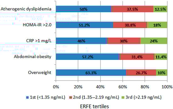 Background: Recent studies suggest that erythroferrone (ERFE), an iron-regulating protein whose primary role is to inhibit hepcidin synthesis, may affect glucose and lipid metabolism, and its serum concentration is reduced in obese and diabetic individuals. The aim of this study was to evaluate the association of ERFE concentration with selected cardiometabolic risk factors in apparently healthy young adults. Methods: This preliminary study consisted of 122 (63 females, 59 males) normoglycemic, non-smoking subjects aged 25–40 years. In all participants, anthropometric measurements and the following laboratory tests were performed: fasting plasma glucose, glycated hemoglobin (HbA1c) and serum iron, lipid profile, insulin, Homeostatic Model Assessment for Insulin Resistance (HOMA-IR), C-reactive protein (CRP), ERFE and hepcidin. Results: The serum ERFE concentration was significantly lower in men compared to women (p = 0.009) and in subjects who were overweight (p < 0.001) and had abdominal obesity (p < 0.001). ERFE showed significant negative correlations with body mass index, waist–hip ratio, HbA1c, CRP, insulin, HOMA-IR and triglycerides. In the logistic regression analysis, ERFE was significantly associated with being overweight (OR = 0.051; p = 0.004), abdominal obesity (OR = 0.372; p < 0.001), HOMA-IR ≥ 2.0 (OR = 0.584; p = 0.013), CRP > 1 mg/L (OR = 0.648; p = 0.020) and triglycerides (OR = 0.521; p = 0.033). A relevant predominance in the prevalence of cardiometabolic risk factors was observed in subjects with ERFE levels in the first tertile (<1.35 ng/mL), compared to the third tertile (>2.19 ng/mL). Conclusions: Serum ERFE is inversely associated with being overweight, increased waist circumference, CRP, and markers of insulin resistance and lipid abnormalities, suggesting its potential relevance as a marker of early cardiometabolic risk in apparently healthy young adults.