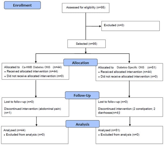 Background/Objectives: Sarcopenia is common in patients with diabetes mellitus. The use of branched-chain amino acids may influence muscle mass. The aim of this study is to evaluate the effect of a diabetes-specific formula enriched with calcium hydroxy-methyl-butyrate (CaHMB) on muscle mass in