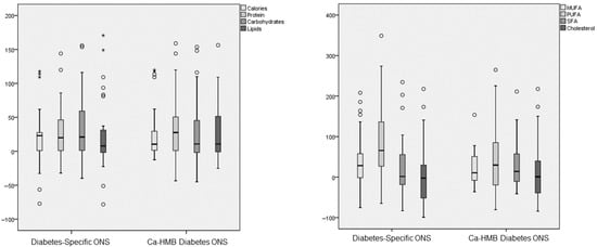 Background/Objectives: Sarcopenia is common in patients with diabetes mellitus. The use of branched-chain amino acids may influence muscle mass. The aim of this study is to evaluate the effect of a diabetes-specific formula enriched with calcium hydroxy-methyl-butyrate (CaHMB) on muscle mass in patients with diabetes and high risk of malnutrition. Methods: A prospective observational study in 95 patients divided into two cohorts of patients with diabetes, treated with a tailored diet, dietary counseling, and diabetes-specific oral nutritional supplements (ONSs) administered between meals: one enriched with CaHMB (CaHMB Diabetes ONS) 44 (46.32%) patients; and another without CaHMB (Diabetes-Specific ONS) 51 (53.68%) patients. Anthropometric parameters, bioimpedance, artificial intelligence (AI)-assisted ultrasound of the rectus femoris muscle (PIIXMEDTM), and handgrip strength were assessed. Evaluations were conducted at baseline and after 3 months. Results: The mean age was 71.05 (10.67) years; 56.8% were male. After three months, both groups increased their nutritional intake with no differences in dietary protein content between groups. The CaHMB group showed a greater increase in muscle mass as measured by ultrasound, both in muscle area (CaHMB ONS: +5.84 (−3.3 ± 21.58)% vs. Diabetes-Specific ONS: −9.34% (−25.78 ± 12.02)%; p < 0.01) and muscle thickness (CaHMB ONS: +9.17 (−4.40 ± 21.05)% vs. Diabetes-Specific ONS −6.30 (−18.57 ± 12.56)%; p < 0.01). The CaHMB ONS group showed a higher likelihood of increased muscle mass compared to the Diabetes-Specific ONS, with an odds ratio (OR) of 9.31 (95%CI: 2.16–40.13) for thickness and 3.96 (95%CI: 1.11–14.13) for area, adjusted for gender, age, serum albumin, and baseline glycated hemoglobin. Conclusions: Supplementation with Ca-HMB in patients with diabetes and high risk of malnutrition showed significant improvements in muscle mass as assessed by AI-assisted ultrasound. Both groups increased nutritional intake, but only the CaHMB group showed specific benefits in muscle parameters.