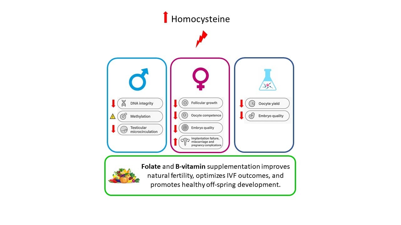Background: Homocysteine (Hcy) plays a pivotal role in human reproduction, influencing gamete quality, embryo development, implantation, and pregnancy outcomes. It is central to folate and methionine metabolism and supports methylation-dependent epigenetic processes. Hyperhomocysteinemia (HHcy) exerts diverse biological effects and is associated with reproductive impairments in both sexes, affecting both spontaneous fertility and the outcome of assisted reproduction, including In Vitro Fertilization (IVF). Although the mechanisms of HHcy toxicity in reproduction are not fully understood, significant progress has been made in elucidating its effects. The emerging picture is complex, as Hcy and its metabolites impact biomolecules and cellular processes in a tissue- and sex-specific manner. Results: In men, HHcy compromises sperm deoxyribonucleic acid (DNA) integrity, methylation, and testicular microcirculation, reducing fertility potential. In women, HHcy disrupts follicular growth, oocyte competence, embryo quality, and endometrial receptivity, increasing the risk of implantation failure, miscarriage, and pregnancy complications. In assisted reproduction, HHcy and 5,10-methylenetetrahydrofolate reductase (MTHFR) variants may lower oocyte yield and embryo quality, although folate and B-vitamin supplementation can mitigate these effects. Conclusions: These effects largely reflect oxidative, inflammatory, vascular and epigenetic mechanisms, highlighting Hcy as a modifiable factor for improving natural fertility, optimizing IVF outcomes, and supporting healthy offspring development.