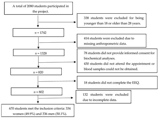 Background/Objectives: Emotional eating is a behavioral pattern in which individuals increase food intake in response to emotional states rather than physiological hunger. University students are particularly vulnerable due to academic stress, lifestyle changes, and a food environment dominated by highly palatable options. Although emotional eating has been associated with adiposity and metabolic alterations, evidence in Mexican university populations remains limited. This study aimed to estimate the prevalence of emotional eating and to examine its association with anthropometric and biochemical indicators in students from the Universidad Autónoma de Querétaro (UAQ). Methods: A cross-sectional study was conducted among 670 first-year university students participating in the SU SALUD-UAQ clinical evaluation. Emotional eating was assessed using the 10-item Emotional Eater Questionnaire (EEQ). Anthropometric measures (body mass index BMI, body fat percentage, and waist circumference) and biochemical markers (triglycerides, total cholesterol, HDL cholesterol, and glucose) were obtained through standardized clinical procedures. Associations were evaluated using multivariable linear and logistic regression models adjusted for sex, age, physical activity level, sleep duration, stress, and socioeconomic status. Results: The prevalence of emotional eating categories was as follows: non-emotional (33.5%), low emotional (31.1%), emotional (27.6%), and highly emotional (7.8%). Higher EEQ scores were independently associated with greater BMI, body fat percentage, and waist circumference in both sexes. In women, emotional eating was also independently associated with less favorable lipid profiles. In addition, students classified as emotional or highly emotional eaters showed higher odds of general and abdominal obesity, particularly among women. Conclusions: Emotional eating is highly prevalent among Mexican university students and is independently associated with increased adiposity in both sexes and with altered lipid profiles in women. These findings highlight the relevance of integrating emotional regulation strategies into university health programs as a component of comprehensive health promotion approaches aimed at addressing emotional eating and its associated anthropometric and metabolic correlates in young adults.