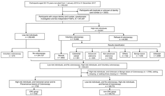 Objectives: Disruptions in circadian-related behaviors are emerging as potential risk factors for gastrointestinal cancers. This study investigated the independent and joint associations of nightly fasting duration and sleep duration with the risk of colorectal cancer (CRC) among community-dwelling Chinese older adults. Methods: Participants were drawn from the Guangzhou CRC Screening Program, which used a questionnaire-based investigation, two separate fecal occult blood tests (FOBTs) for risk evaluation, and colonoscopy for high-risk individuals. Of the 347,297 people initially screened, 197,507 individuals were finally included after excluding 100,930 cases with missing eating/sleeping data or unknown/benign lesions via colonoscopy. Among the final sample, 351 CRC cases and 1384 precancerous lesions were diagnosed, while 195,772 individuals had negative results. Habitual times for dinner, breakfast, bedtime, and wake-up were used to define nightly fasting duration (dinner-to-breakfast) and nightly sleep duration (bedtime-to-wake). Multivariable logistic regression, subgroup analyses, and sensitivity analyses were performed to evaluate the associations. Results: In the fully adjusted models, each 1-h increment in nightly fasting duration was associated with a 9.5% (95% CI 1.039–1.153) higher risk of CRC, and the direct association was limited to individuals over 60 years (OR = 1.147, 95% CI 1.073–1.226), while each 1-h increment in nightly sleep duration was associated with a 15.2% (95% CI 0.806–0.893) lower risk of CRC. Consistently, earlier dinner, later breakfast and later bedtime were also associated with a higher CRC risk. Conclusions: In Guangzhou older residents, long nightly fasting duration was a risk factor for CRC, especially among individuals over 60 years old; while long nightly sleep duration was protective. These findings suggest that maintaining adequate sleep and optimizing the nightly fasting window may be viable lifestyle strategies for CRC prevention, emphasizing the need for tailored preventive measures for different age groups.