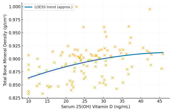 Background/Objectives: Vitamin D plays a central role in calcium and bone homeostasis; however, evidence linking serum 25-hydroxyvitamin D (25(OH)D) to bone mineral density (BMD) in postmenopausal women remains inconsistent. Because body weight and lean mass strongly influence skeletal loading and may also