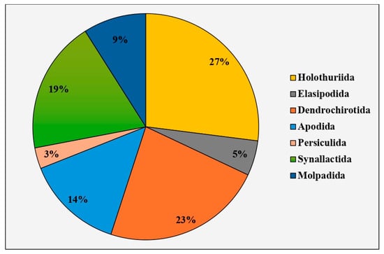 Holothuroids play a vital role in nutrient cycling and bioturbation to enhance the marine ecosystem. They enhance the biodiversity for various symbiotic marine organisms by providing essential shelter and spawning grounds. This review focuses on the Class Holothuroidea (Phylum Echinodermata) in Indian waters, encompassing a total of 187 species organized into 7 orders and 21 families. Notably, the order Holothuriida represents the largest proportion of species, accounting for 27%. These species are well-distributed across India, with the Andaman and Nicobar Islands exhibiting the highest level of species richness (107 species), followed by the East Coast (102 species), Lakshadweep (39 species), and the West Coast (34 species). Species diversity was assessed using the Shannon–Weiner diversity index. Results indicate that the Andaman and Nicobar Islands (H’ = 2.23) and the West Coast (H’ = 2.14) demonstrate the highest levels of diversity. This review provides a comprehensive and precise inventory of all species of Holothuroidea reported in Indian waters, which is provided to facilitate understanding of the reported species, their systematics, and distribution. In addition, a significant insight for both conservation and management of sea cucumbers in India has also been provided.
