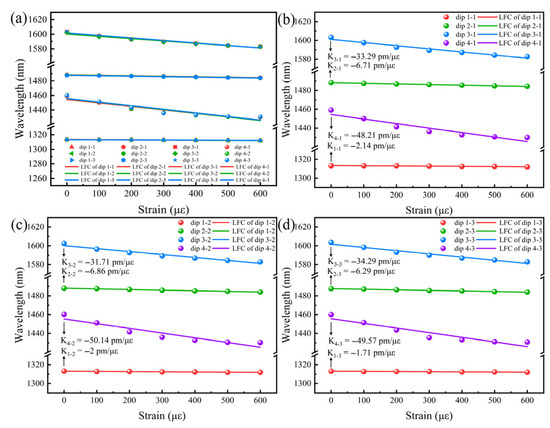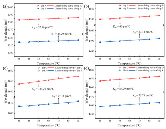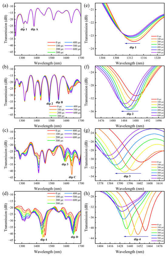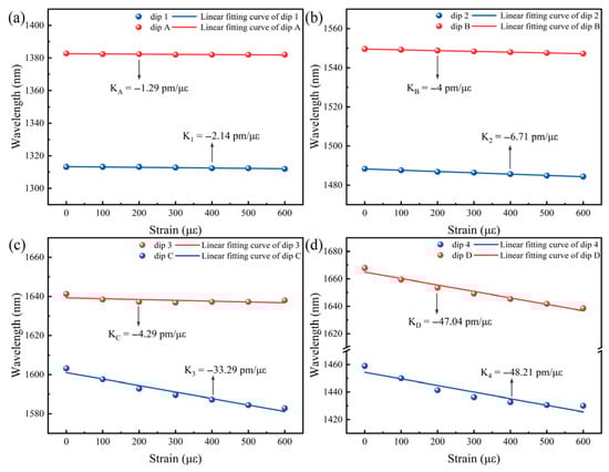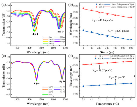 A composite fiber optic sensor based on a misaligned peanut-shaped structure and the single-mode fiber–multimode fiber–single-mode fiber (SMS) structure is proposed for simultaneous strain and temperature measurements. The misaligned peanut-shaped structure is formed by introducing a certain core-offset during fusion splicing. Through a simulation analysis of the sensor, the optical field distribution of the sensor structure under different offset amounts is obtained. The experimental results demonstrate that the sensor achieves a maximum strain sensitivity of −48.21 pm/µε with an offset of 35.61 µm under a strain range of 0–600 µε and a maximum temperature sensitivity of 124.29 pm/°C at a 24.35 µm offset with a temperature range of 35–95 °C. Meanwhile, the sensor with a 35.61 µm offset has two resonance peaks that are selected for simultaneous measurements, with strain sensitivities of −48.21 pm/µε and −47.04 pm/µε and temperature sensitivities of 75.71 pm/°C and 84.29 pm/°C, respectively. Therefore, the simultaneous measurement of the strain and temperature can be achieved through a matrix method, demonstrating that the sensor possesses a dual-parameter sensing capability for the strain and temperature.