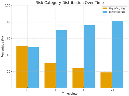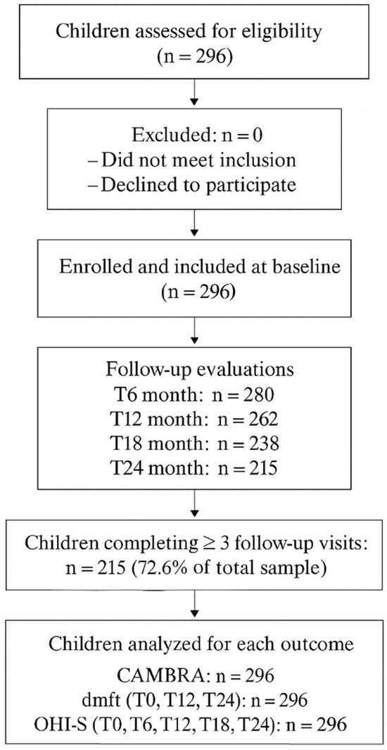 Background/Objectives: Dental caries remains one of the most prevalent chronic diseases in early childhood, and traditional preventive strategies often fail to achieve sustained risk reduction without individualized management. The Caries Management by Risk Assessment protocol (CAMBRA) provides a structured, risk-based preventive approach integrating clinical and behavioral indicators. This study evaluated the two-year effectiveness of a CAMBRA-based prevention program in preschool children. Methods: A prospective observational cohort study was conducted in a university-affiliated pediatric dentistry clinic in Italy. A total of 296 children aged 4–6 years were enrolled and classified into caries risk categories according to CAMBRA criteria. Personalized preventive plans included oral hygiene education, dietary counselling, fluoride applications, and sealants where indicated. Clinical outcomes were assessed over a 24-month follow-up period. Results: Over two years, a substantial shift toward lower caries risk categories was observed, with the proportion of children classified as High/ Very High risk markedly reduced. Improvements were also recorded in caries experience (dmft) and oral hygiene status (OHI-S). Greater adherence to scheduled follow-up visits was associated with a higher likelihood of clinical improvement. Conclusions: A CAMBRA-based, risk-guided preventive program implemented in a public pediatric dental setting was associated with meaningful improvements in caries risk profiles and oral health parameters over 24 months. Regular follow-up and caregiver engagement appear to be key factors in sustaining preventive benefits in high-risk preschool populations.
