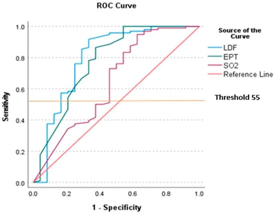 This study aimed to explore the added value and usage of laser Doppler flowmetry (LDF) in conjunction with continuous tissue (arterial) oxygen saturation (SO2) monitoring, electrical pulp testing (EPT), cold stimulation (CS) testing, and apical X-rays (RX). LDF data were evaluated in relation to three different scenarios. LDF records of all four upper incisors from 30 randomly selected patients aged 21–40 were analysed in relation to the following scenarios: (a) simultaneous SO2 measurements using a pre-manufactured splint handled by an experienced LDF dentist, (b) EPT, and (c) CS. A total of 120 teeth were analysed, of which 11 were non-vital (7 denervated and 4 traumatised). Data assessment showed the following mean LDF values: vital teeth: 23.6 Perfusion Units (PU), SD 6.3 and SaO2 of 88.7%, SD 17.1. For non-vital teeth, the mean LDF value was 16.1 PU (SD 11.8) and the mean SO2 value was 70.8% (SD 31.9). The standard deviation was found to be twice as high for non-vital teeth as for vital teeth. No direct relationship was found between LDF and SO2 values at low SO2. For vitality discrimination, the ROC curves showed an area under the curve of 0.799 for LDF and 0.643 for SO2. EPT data assessment showed a mean value of 18.1 (SD 19.7) out of a possible score of 0–80. This was distributed as follows: seven non-vital teeth (80/80); 109 vital teeth; and four undecided teeth. This was compared to the LDF and SO2 results. The data assessment showed nine non-vital teeth, 108 vital teeth, and three undecided teeth in comparison to LDF and SO2 results. Conclusion: LDF and SO2 do not complement each other sufficiently in detecting non-vital teeth when the selection criteria are applied. While LDF clearly contributes, the vital or non-vital classification still depends on a combination of X-ray, sensitivity, and vitality tests.