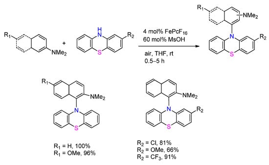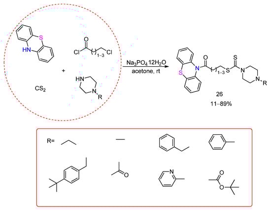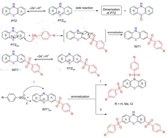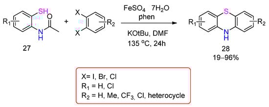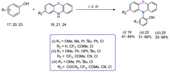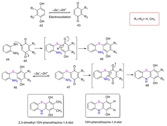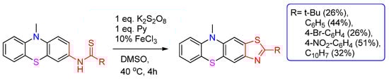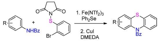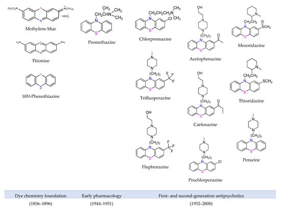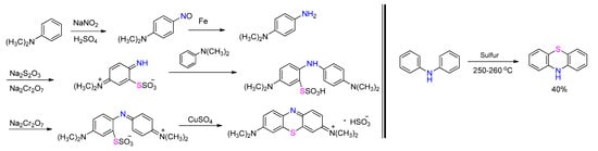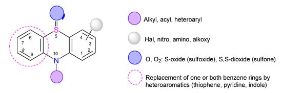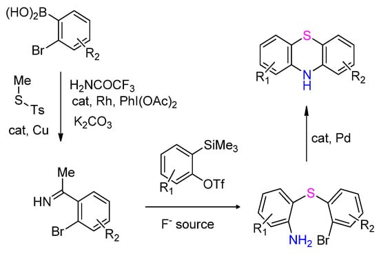 This review offers a focused overview of the strategies used to build and modify phenothiazine (PTZ) derivatives. It covers both classical synthetic approaches and advances reported since 2014, including transition metal-catalyzed transformations and greener techniques, such as electrosynthesis, microwave-assisted reactions, and ultrasound-promoted methods.