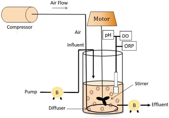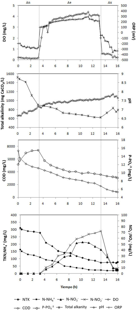 Swine effluents require effective treatment due to their high pollutant load, particularly nitrogen and phosphorus, which can cause eutrophication of water bodies. This study focused on monitoring nutrient removal in a sequential biological reactor through online measurements of parameters such as dissolved oxygen (DO), pH, oxidation-reduction potential (ORP), and total alkalinity during the treatment of effluents from a pig slaughterhouse. A laboratory-scale reactor was used, operated with timer switches in an anaerobic–aerobic–anoxic sequence, a sludge retention time (SRT) of 25 days, and an operational cycle time of 16 h. The reactor demonstrated notable efficiency in contaminant removal, with an average organic matter removal of 87.1% measured as chemical oxygen demand (COD) and 95.5% as biochemical oxygen demand (BOD). Regarding nitrogen and phosphorus removal, a 69.4% reduction in total nitrogen (TN) and a 53.2% reduction in total phosphorus (TP) were observed. The pH, ORP, and DO profiles showed a clear correlation with the nutrient removal processes, allowing optimization of the phase durations in the reactor to enhance treatment efficiency.