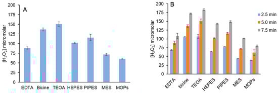 Photosensitized excitation of molecular oxygen generates singlet oxygen, a reactive oxygen species that has been studied in biological systems, synthetic methods and in aquatic ecosystems. The reaction of singlet oxygen with tertiary amines is important because they are widely used as electron donors in photochemical reactions. Herein we studied the reaction of singlet oxygen with multiple tertiary amines including ethylenediamine tetraacetic acid (EDTA), triethanolamine (TEOA) and triethylamine (TEA). Singlet oxygen was generated using the photosensitizers methylene blue or chlorin e6 and red light with output at 660 nm. TEOA and TEA generated more hydrogen peroxide (H2O2), the stable end product, than EDTA at all pH values tested and regardless of the photosensitizer used. Both histidine and imidazole scavenged singlet oxygen and decreased H2O2 yield. The extent of histidine scavenging was pH-dependent for the combination of methylene blue and EDTA but not for TEOA or TEA. The combination of chlorin e6 and EDTA generated less H2O2 because both contain multiple negative charges that limit their interaction. Multiple tertiary amines that are used as biochemical buffers produced similar quantities of H2O2 as EDTA, TEOA and TEA. However, these sulfonic acid-containing tertiary amines did not function as electron donors in a benzoquinone photoreduction assay.