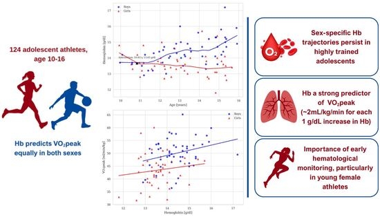 Maximal aerobic power (V̇O2peak) in youth depends on hemoglobin (Hb)—mediated oxygen transport. While sex- and age-specific patterns are established in untrained cohorts, further research is needed in competitive adolescent athletes. We studied 124 young athletes matched by age and sex (62