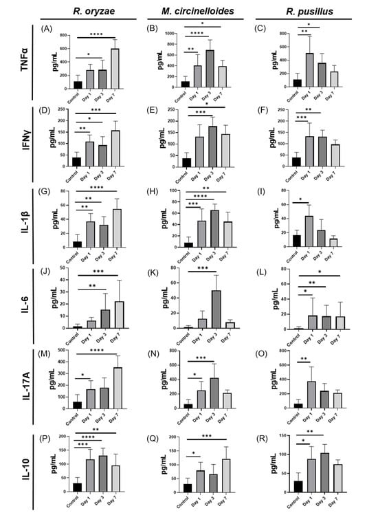 Mucormycosis is a life-threatening infection caused by fungi of the Mucorales order, typically associated with immunocompromised hosts, but increasingly reported in immunocompetent individuals. This study investigated fungal burden, Th1/Th17 inflammatory profiles, and organ-specific dynamics in immunocompetent BALB/c mice intravenously infected with Rhizopus oryzae