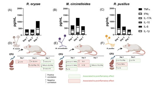 Mucormycosis is a life-threatening infection caused by fungi of the Mucorales order, typically associated with immunocompromised hosts, but increasingly reported in immunocompetent individuals. This study investigated fungal burden, Th1/Th17 inflammatory profiles, and organ-specific dynamics in immunocompetent BALB/c mice intravenously infected with Rhizopus oryzae, Mucor circinelloides, or Rhizomucor pusillus. Colony-forming units were quantified in spleen, liver, and kidney at multiple time points, while serum cytokines and oxidative stress markers were analyzed. The results showed fungal persistence primarily in the spleen, accompanied by species-specific Th1/Th17 responses: R. oryzae induced the highest inflammatory response among all groups, with maximal cytokine production observed on day 7, particularly for IL-17A (352.58 pg/mL). In contrast, M. circinelloides exhibited its peak cytokine levels earlier, reaching the highest TNF-α concentration on day 3 (425.43 pg/mL). Meanwhile, R. pusillus triggered an early but moderate inflammatory response, with a maximum TNF-α value of 372.62 pg/mL detected on day 1, followed by clearance. Correlation analysis highlighted distinct immunological patterns, with IL-10 acting as a negative regulator of inflammation, while TNF-α and IL-17A reflected infection intensity depending on species and timing. The spleen emerged as a key organ coordinating immune responses during systemic infection. These findings reveal that mucormycosis in immunocompetent hosts triggers complex, species-dependent immune dynamics beyond classical immunosuppression, emphasizing the need to consider host–pathogen interactions when developing targeted antifungal strategies.