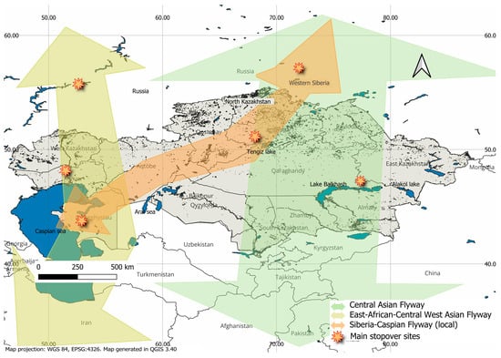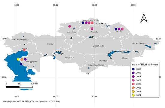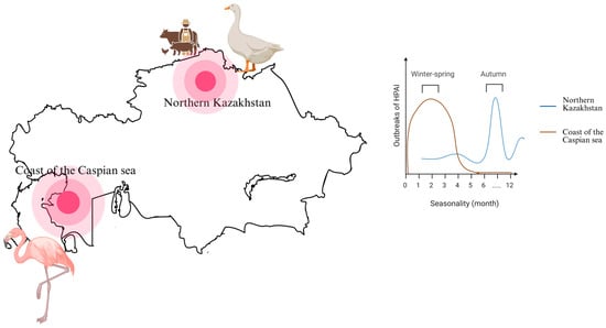 This review analyzed the epidemiology and impact of HPAI (H5N1 and H5N8) in migratory birds and poultry in Kazakhstan, with a special focus on outbreaks from 2005 to 2024. A comprehensive bibliographic analysis of publications on avian influenza in Kazakhstan over the past