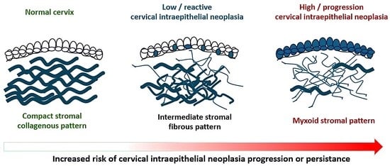 Objectives: To evaluate the diagnostic and prognostic value of histophenotyping of the extracellular matrix of the cervical stroma at cervical intraepithelial neoplasia (CIN). Methods: Retrospective analysis of 160 biopsies and surgical preparations of the cervix in women of reproductive age included cases of CIN 1–3 and the group with confirmed persistence or lesion progression (CIN P) at repeated biopsy. The control group (n = 40) consisted of morphologically intact cervical tissue. Histophenotypes were evaluated by staining with hematoxylin, eosin, and Masson trichrome, and classified as follows: normal (dense parallel bundles of type I collagen), intermediate (disorganized and fragmented type I collagen fibers), and myxoid (amorphous weakly fibrillar matrix). The clinical, viral, and inflammatory characteristics between histophenotypes were statistically compared. Results: The distribution of histophenotypes of the extracellular matrix of the cervix varied significantly depending on the CIN degree (p < 0.001). In the control group, the normal pattern was detected in 97.5% of cases; its frequency decreased from CIN 1 (27.5%) to CIN 2 (12.5%) and was absent at CIN 3. The frequency of the myxoid pattern increased significantly in severe and persistent forms: 55% at CIN 3 and 62.5% at CIN P. Human papillomavirus 16/18 was most frequently detected in groups with intermediate (69.1%) and myxoid (27.2%) patterns. Inflammatory changes were more often accompanied by disorganized extracellular matrix; however, intermediate and myxoid types also occurred in the absence of inflammation. Conclusions: The myxoid histophenotype of the extracellular matrix is significantly associated with the high degree of dysplasia and CIN persistence. It can reflect the morphological equivalent of tumor-associated stroma remodeling. Histophenotyping of the extracellular matrix of the cervix appears to be a promising method of risk stratification and may complement existing diagnostic algorithms for CIN.