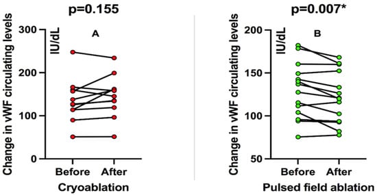 Background: Thromboembolic events, though infrequent, remain a significant complication of atrial fibrillation (AF) ablation, largely related to endothelial damage. Cryoballoon (CB) and radiofrequency ablation can induce pro-coagulant responses, whereas pulsed-field ablation (PFA), a novel non-thermal electroporation-based technique, has shown tissue selectivity with potential endothelial-sparing effects. Methods: We aimed to compare PFA and second-generation CB ablation regarding endothelial injury in patients with paroxysmal AF. In this single-center prospective observational study, 25 patients with paroxysmal drug-refractory AF underwent pulmonary vein isolation using either a pentaspline PFA catheter (n = 14) or a second-generation CB catheter (n = 11). Circulating von Willebrand factor antigen (vWF) levels were assessed before and after ablation as a biomarker of endothelial damage, alongside routine laboratory and echocardiographic parameters. Procedural characteristics were also analyzed. Results: Baseline demographic, clinical, and echocardiographic data were comparable between groups. PFA was associated with significantly shorter skin-to-skin procedure time (59 vs. 94 min, p = 0.005) and left atrial dwell time (44 vs. 79 min, p < 0.001) compared with CB ablation. Importantly, vWF levels decreased significantly after PFA (−7.6%, p = 0.007), while CB ablation showed a non-significant increase (+9.5%, p = 0.155). The between-group difference in percent change of vWF was statistically significant (−5.6% vs. +8.3%, p = 0.006). Conclusions: PFA was associated with reduced endothelial injury and shorter procedural times compared with CB ablation, suggesting a potential advantage in lowering thromboembolic risk. These findings support the concept of PFA as an “endothelial sparing” ablation modality. However, the PFA procedure was associated with a significantly greater extent of myocardial injury, as reflected in circulating high-sensitivity cardiac troponin T values, compared to CB ablation (p = 0.007). Larger, randomized studies are warranted to confirm these results and evaluate long-term clinical outcomes.