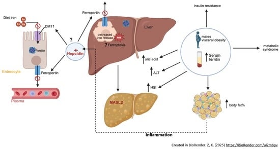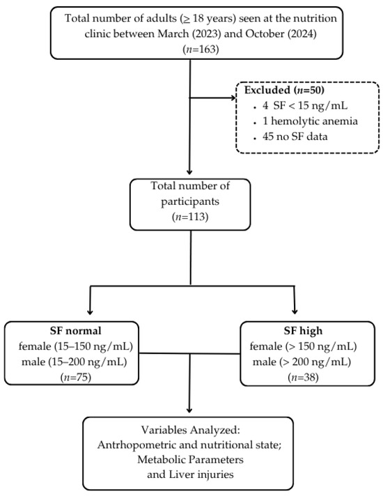 Objectives: Serum ferritin (SF) reflects iron homeostasis, in addition to being an acute phase reactant protein. Since its levels are altered in the obesity state, we compared body composition, metabolic profile, liver alterations, and dietary patterns in adults stratified by SF levels (normal vs. high). Methods: A cross-sectional study was conducted using secondary data from 113 adults (≥18 years) of both sexes, attended at an outpatient nutrition clinic in southern Brazil and categorized for normal or high SF. Socioeconomic, anthropometric, blood pressure, dietary, biochemical, and liver parameters were assessed and statistical analyses performed. Results: Participants with high SF were more frequently male (p < 0.0001), married or in a civil union (p = 0.012), and had lower educational levels (p = 0.009). Moreover, higher rates of obesity (p = 0.003), cardiovascular risk (p = 0.004), increased body fat percentage (BF%; p = 0.002) and metabolic disturbances such as elevated glucose (p = 0.023), triglycerides (p = 0.003), insulin resistance (p = 0.027), hypertension (p = 0.001), and metabolic syndrome (MS) (p = 0.001) were noted in this group. Liver-related findings comprised increased ALT (p = 0.008), uric acid (p = 0.016), and indicators of steatosis (p = 0.022). Logistic regression demonstrated a higher likelihood of elevated SF among men (OR = 16.82) and individuals with increased BF% (OR = 7.5), without significant influence of diet. Conclusions: Adults with elevated SF were predominantly obese men with excess adiposity, insulin resistance, and metabolic and hepatic dysfunctions, conditions that increase the risk of MS and liver injury. These findings suggest that SF and other iron biomarkers may serve as valuable tools for diagnosing metabolic dysfunctions and obesity-related liver diseases, particularly Metabolic Dysfunction-Associated Steatotic Liver Disease (MASLD).