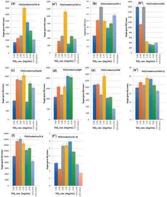 This study examines the potential in vitro application of different concentrations of titanium dioxide (TiO2) nanoparticles (NPs) irradiated with UV light for the sanitation of recirculating aquaculture systems (RASs) and their antiviral activity. The diverse effects of Nodavirus on immune gene