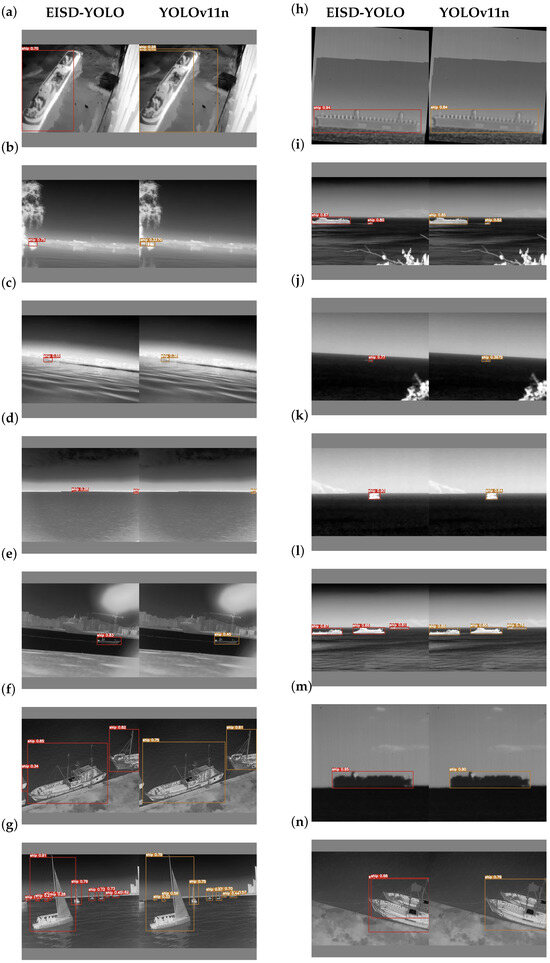 Ship detection is critical for maritime traffic management, as infrared imaging in complex marine environments encounters significant challenges, such as strong background interference and weak target features. Thus, we propose EISD-YOLO (Efficient Infrared Ship Detection-YOLO), a high-performance lightweight algorithm specifically designed for infrared ship detection. The algorithm aims to improve detection accuracy while simultaneously reducing model parameters and enhancing computational efficiency. It integrates three core architectural innovations: first, we optimized the backbone C3k2 module by replacing the traditional bottleneck with a PEMA block to significantly reduce the parameter count; second, we integrated a lightweight DS_ADNet module, using depth-wise separable convolution to reduce parameters and alleviate computational load while maintaining robust feature representation; and third, we adopted the DyTAHead detection head, which integrates classification and localization features through dynamic task alignment, thereby achieving robust performance in complex infrared ship detection scenarios. The experimental results on the IRShip dataset demonstrate that, compared with YOLOv11n, EISD-YOLO reduced the parameters by 48.83%, while mAP@0.50, precision, and recall all increased by 1.2%. This breaks the traditional rule that lightweight models inevitably lead to reduced accuracy. Additionally, the model size reduced from 10.1 MB to 5.7 MB, which highlights its enhanced computational efficiency and practical applicability in maritime deployment scenarios.