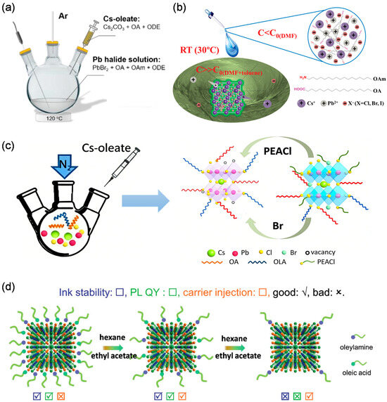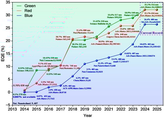 Perovskite quantum dots (PeQDs) are highly promising luminescent materials for next-generation displays owing to their excellent optoelectronic properties, such as narrow emission linewidth, high photoluminescence quantum yield, tunable bandgap, and solution processability. Blue-emitting PeQDs are particularly crucial for realizing full-color displays with high color purity. This review systematically summarizes synthesis strategies for blue-emitting PeQDs and their recent advances in perovskite light-emitting diodes (PeLEDs). We first introduce the working principles of PeLEDs and detail three primary approaches to achieving blue emission through mixed-halide engineering, quasi-two-dimensional structure construction via A-site cation substitution, and quantum size effect utilization. We then review mainstream synthesis methods, including hot-injection, ligand-assisted reprecipitation, and post-synthetic anion exchange, discussing their respective advantages and limitations. Key device optimization strategies are also outlined, covering surface passivation, core–shell structures, interface engineering, and light outcoupling enhancement. Finally, we address current challenges in material stability, efficiency roll-off, and charge imbalance and provide an overview of future research directions for high-performance blue PeLEDs based on PeQDs.