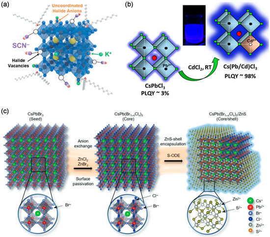 Perovskite quantum dots (PeQDs) are highly promising luminescent materials for next-generation displays owing to their excellent optoelectronic properties, such as narrow emission linewidth, high photoluminescence quantum yield, tunable bandgap, and solution processability. Blue-emitting PeQDs are particularly crucial for realizing full-color displays with high