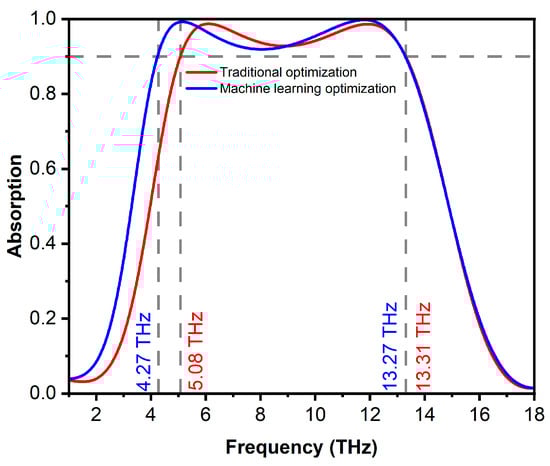 This paper introduces a vanadium dioxide-integrated broadband metamaterial absorber designed for the terahertz frequency range. The simulation results for the proposed structure demonstrate a wide 90% absorption bandwidth of 8.23 THz, corresponding to a fractional bandwidth of 89.5%. By leveraging the phase-transition properties of VO2, the absorber demonstrated dynamic adjustability by modulating the absorption from 3% to 98.74%. The absorption mechanism was analyzed through the impedance matching theory and electromagnetic field distributions, confirming the role of magnetic resonance and interference. Furthermore, machine learning algorithms, specifically Linear Regression, Support Vector Regression, and Random Forest (RF), were applied to accelerate the design process and optimize the structural parameters. Among these, the RF model demonstrated superior prediction accuracy. The machine learning-assisted optimization successfully extended the effective absorption bandwidth to 9 THz, representing an improvement by 9.4% compared to the traditional optimization methods. These results validate the efficacy of combining electromagnetic simulation with data-driven techniques for advanced metamaterial design.