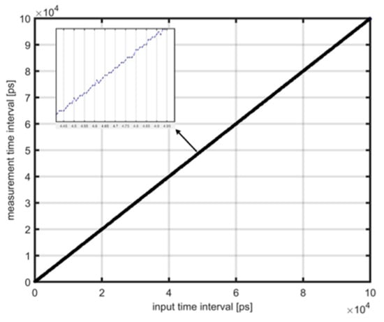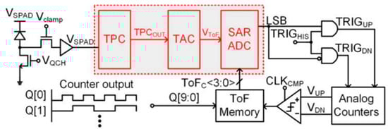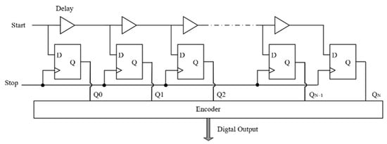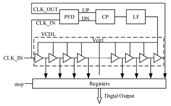 As the mainstream technology solution for deep imaging LiDAR, dToF measurement has been widely applied in emerging fields such as environmental perception and obstacle recognition, 3D terrain reconstruction, real-time motion capture, and drone obstacle avoidance navigation due to its advantages of high resolution, long-range detection capability, and high sensitivity. In order to adapt to functional applications in different scenarios, the resolution of TDC needs to be adjustable and can work normally in different environments. In view of this, this article studies the pixel array and TDC circuit in the chip and locks a voltage-controlled ring oscillator (VCRO) with the same structure as the pixel to a fixed frequency through a PLL structure. Then copy the control voltage of the locked VCRO to the control terminal of the TDC in each pixel. In an ideal situation, this control voltage can make the oscillation frequency of VCRO within the pixel consistent with the locking frequency of VCRO within the PLL, and insensitive to changes in PVT. This study developed a module expandable 16 × 16-pixel array dToF sensor chip based on TDC architecture using CMOS technology. Finally, six configurable 16 × 16-pixel subarrays were integrated and constructed into a 32 × 48 large-scale dToF sensor chip through modular splicing. The top-level layout design was completed using SMIC 180 nm technology, with a layout area of 5285 µm × 3669 µm. Post-simulation verification showed that, under the testing conditions of a 400 MHz system clock and a 33.3 kHz frame rate, the dToF chip system performance indicators were: time measurement resolution of 156 ps, DNL < 1 LSB, INL < 0.85 LSB, and absolute ranging accuracy better than 2.5 cm.