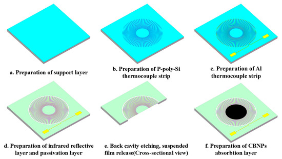 This study demonstrates a high-performance thermopile infrared detector that incorporates a carbon black nanoparticle (CBNP) absorption layer. To overcome the limitations associated with conventional infrared-absorbing materials—including high cost, complex fabrication, and constrained spectral response—a highly porous CBNP thin-film absorption layer was deposited onto the thermopile sensing area using inkjet printing. Combined with an optimized microcavity design, this approach significantly enhances the photothermal conversion efficiency of the device. Experimental results indicate that the detector equipped with the CBNP absorption layer achieves a responsivity of 47.9 V/W and a detectivity of 1.14 × 108 cm·Hz1/2·W−1. These values represent improvements of 34.55% in responsivity and 34.28% in detectivity, respectively, compared to a reference device without the CBNP layer. This work provides a promising strategy for the development of low-cost yet high-performance infrared detectors.