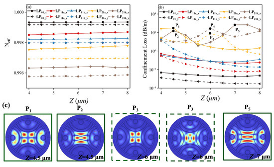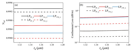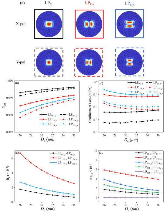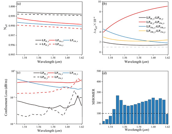 A nested semi-tube hollow-core anti-resonant fiber (HC-ARF) that can support the high-purity transmission of a few polarization-maintaining modes is designed in this paper. By employing bi-thickness hybrid silica/silicon anti-resonant tubes, the birefringence of the orthogonal polarized modes is significantly improved, and the weak coupling condition of the five lowest-order polarization maintaining modes, including the LP01_x, LP01_y, LP11a_x, LP11b_x, and LP11a_y, can be met. The effective refractive index difference between each pair of the supported adjacent modes is larger than 1.0 × 10−4. With hybrid multi-layer nested semi-tubes, the confinement losses of the supported modes are all less than 1.50 × 10−1 dB/m within a transmission band from 1.530 to 1.620 μm. The minimum confinement losses of the LP01_y, LP01_x, LP11a_y, LP11a_x, and LP11b_x modes are 3.71 × 10−4 dB/m, 1.61 × 10−3 dB/m, 2.00 × 10−2 dB/m, 1.30 × 10−1 dB/m, and 4.20 × 10−2 dB/m, respectively. Meanwhile, the unwanted higher-order modes are filtered out well to guarantee the modal purity. The minimum higher-order-mode extinction ratio of the lowest-loss LP21 mode to the highest-loss LP11 mode remains larger than 139 from 1.545 to 1.615 μm. The numerical results highlight the potential of the proposed polarization-maintaining few-mode hollow-core anti-resonant fibers in many application fields, such as short-range and high-capacity data transmission networks, fiber sensing systems, quantum communication systems, and so on.