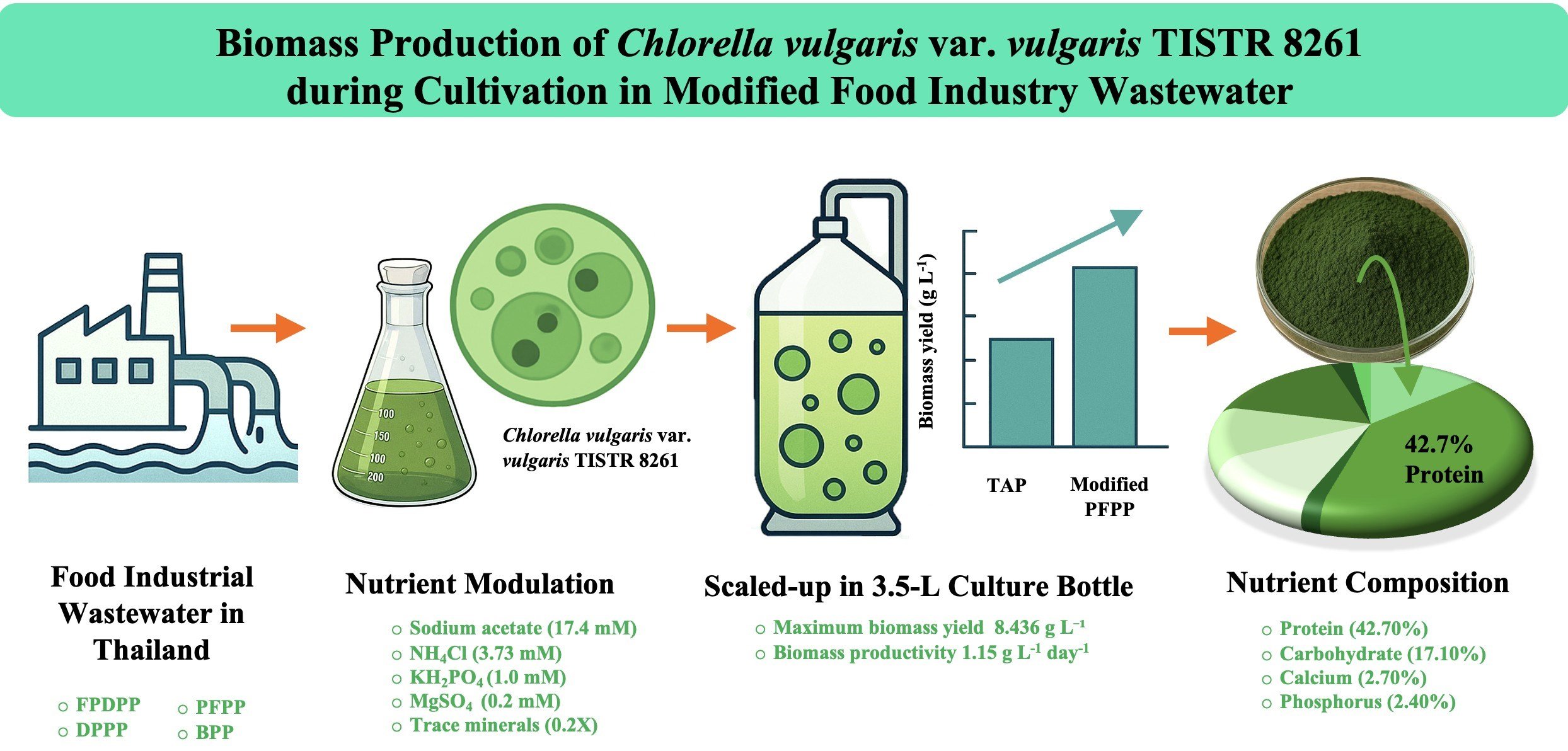 Industrial wastewater can serve as a low-cost nutritional source for sustainable microalgal biomass production. This study investigated the biomass of Chlorella vulgaris var. vulgaris TISTR 8261 grown in untreated wastewater collected from four food industry factories in Phra Nakhon Sri Ayutthaya Province, Thailand.