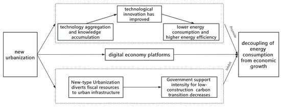 China’s urbanization has entered a stage of high-quality development, yet persistent urban expansion and the rapid rise of the digital platform economy have driven up energy consumption, making the decoupling of energy use from economic growth increasingly urgent. To address this challenge, this study examines how new urbanization influences the decoupling of energy consumption from economic growth in China and explores its underlying mechanisms. Using panel data from 30 Chinese provinces spanning 2014–2023, we employ a two-way fixed-effects model to test our hypotheses. The results indicate that new urbanization significantly suppresses energy-growth decoupling: a 1% increase in the new urbanization index reduces the decoupling index by 0.686 units. The expansion of the digital platform economy intensifies this suppression effect. Concurrently, technological innovation and government support play mediating roles. The study thus concludes that promoting high-quality new urbanization, accelerating technological progress, and strengthening government investment are key pathways to advancing decoupling.