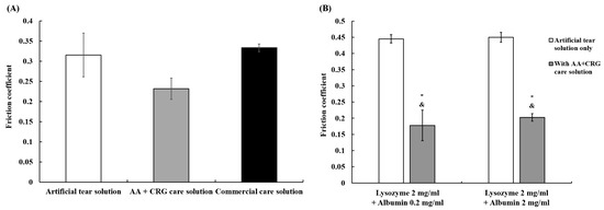 When an orthokeratology (ortho-k) lens contacts the ocular surface, tear film components such as lipids and proteins rapidly adsorb onto the lens, which may increase friction and contribute to discomfort if not properly removed. Polysaccharides have been reported to reduce protein deposition and improve lubrication, prompting the investigation of alginate acid and lambda-carrageenan in modulating the tribological properties of ortho-k lenses. An in vitro tribological property analysis of ortho-k lenses and protein adsorption and desorption analyses were carried out to investigate the lubricating ability of alginate acid and carrageenan. Zeta potential and turbidity analyses were further conducted to examine potential interactions between polysaccharides and tear film proteins. Tear film proteins significantly increased the friction coefficient of the ortho-k lens, whereas the addition of alginate acid and carrageenan markedly reduced friction. Electrostatic interaction and polysaccharide–protein complex formation were identified as possible mechanisms underlying these effects. These results demonstrate that alginate acid and carrageenan can modify the tribological and interfacial behavior of ortho-k lenses in protein-rich environments, suggesting their potential application in reducing friction-related complications in ortho-k lens wearers.