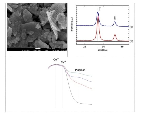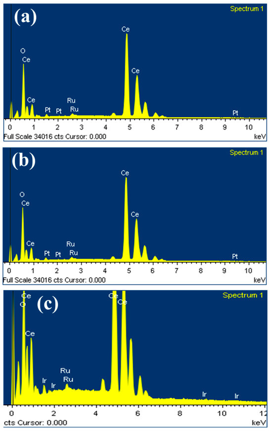 Nanoparticle powders of a Ce1−xRuxO2 mixed oxide (3.0% w/w), were synthesized to be used as catalytic supports, on which Pt and Ir nanoparticles were deposited as the active phase. The catalytic supports were prepared through