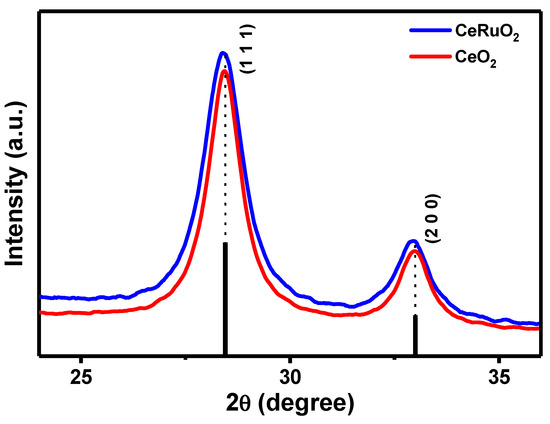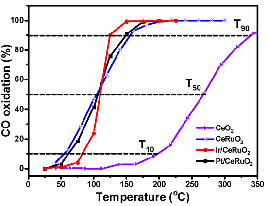 Nanoparticle powders of a Ce1−xRuxO2 mixed oxide (3.0% w/w), were synthesized to be used as catalytic supports, on which Pt and Ir nanoparticles were deposited as the active phase. The catalytic supports were prepared through a route involving microwave heating, while the Pt or Ir nanoparticles were incorporated via the wet incipient method. The {Pt, Ir/Ce1−xRuxO2} catalytic systems were successfully tested as catalysts for low-temperature CO oxidation. To provide adequate support to our results, the compounds were characterized by SEM, EDS, XRD, DRS-UV-vis, and XPS techniques. In addition, BET isotherms were carried out to determine specific surface area features. The CO oxidation evolution was tested in the range of 25–350 °C. Both Pt and Ir supported Ce1−xRuxO2 catalysts that remarkably improved the CO oxidation, reaching and sustaining 100% conversion from 125 °C onwards. Remarkably, the mixed oxide support, by itself, showed outstanding performance, achieving 100% conversion to CO2, at a temperature of 225 °C.