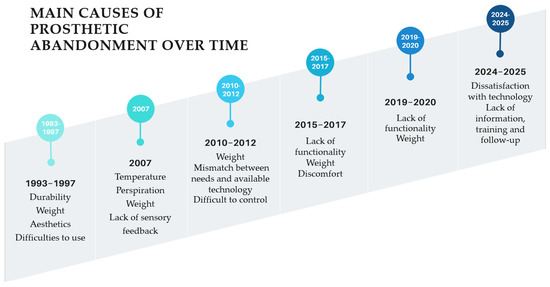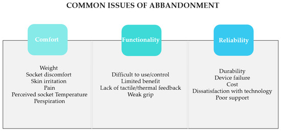 The loss of a limb is an event that significantly affects an individual’s quality of life, with implications not only for autonomy in daily activities but also for their ability to interact with others. At the same time, current prostheses often fail to meet the user’s needs, resulting in high drop-out rates. In this review, we investigated the primary causes of prosthesis abandonment and analyzed them by highlighting the technological and psychological aspects associated with current devices. Technological issues due to reliability, functionality and comfort, together with psychological issues related to anxiety and depression, are among the main factors contributing to prosthesis rejection. Social aspects, sport, and community activities play crucial roles in improving the sense of belonging and acceptance of prosthesis users. Although research has often prioritized functionality, prosthesis development should follow patient-centered models that address the individual needs and requirements of patients, emphasizing psychological, rehabilitative, and technological support.