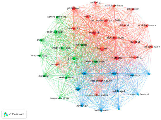 Purpose: Remote work continues to transform both organizational structures and individual work experiences, introducing new dynamics that can simultaneously enhance or undermine employees’ mental health and overall well-being. These evolving conditions influence levels of stress, resilience and burnout within increasingly digital and flexible work environments. The present study aimed to provide a comprehensive understanding of how remote work affects occupational stress, mental health, burnout and employee well-being through a bibliometric analysis of Scopus-indexed literature complemented by a narrative synthesis of emerging research themes. Methods: A total of 185 peer-reviewed documents were retrieved from the Scopus database and analyzed using the VOSviewer software, version 1.6.20 (0) (Leiden University, Leiden, The Netherlands). The study employed performance analysis techniques to assess annual publication trends, identify the most influential authors and sources and evaluate citation impact. Furthermore, science mapping methods, including co-authorship, bibliographic coupling, co-citation, and co-occurrence analyses, were used to visualize the intellectual structure and thematic evolution of the field. Results: The co-occurrence analysis identified three major thematic clusters. We first explored how the abrupt shift to teleworking redefined employee well-being, the second examined the psychological consequences of evolving work environments on mental health and occupational stress and the third investigated the prevalence, determinants and contextual factors of occupational burnout across professional domains. Conclusions: The findings demonstrated complex interrelations among remote work, occupational stress, mental health, and burnout, highlighting that the accelerated adoption of remote work—especially during and after the COVID-19 pandemic—has substantially reshaped employees’ psychological health and work experiences. Thus, remote work emerges as a double-edged phenomenon that can either foster resilience and well-being or heighten stress and burnout, depending on the availability of supportive organizational structures, psychosocial resources, and adaptive coping mechanisms.