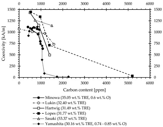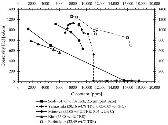 Short-loop recycling of NdFeB trades a reduced ecological burden for a higher sensitivity towards contamination, as the powder is usually further processed as-is. In this investigation, the known effects of common contaminants (O, C, Ni, Cu, and Zn) introduced due to product design