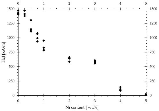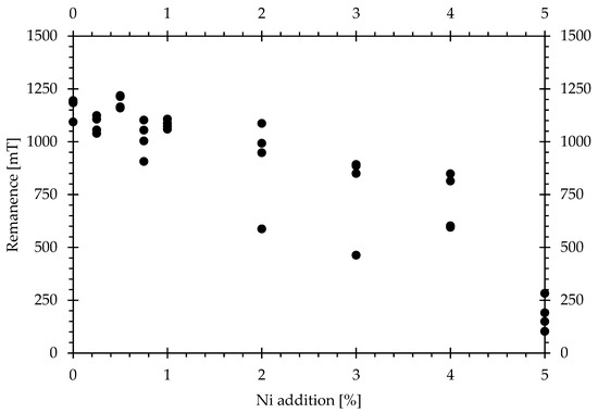 Short-loop recycling of NdFeB trades a reduced ecological burden for a higher sensitivity towards contamination, as the powder is usually further processed as-is. In this investigation, the known effects of common contaminants (O, C, Ni, Cu, and Zn) introduced due to product design choices, namely from coating material and adhesive residue or a lack of corrosion protection, are reviewed. This study focuses on the impact of such contaminants on the magnetic properties and microstructure of recycled magnets via HPMS and re-sintering. Because of the lack of information regarding the practical effects of metallic coating residues, the impact of Ni contamination on the properties of re-sintered NdFeB magnets is assessed. HPMS processed scrap powder is blended with Ni powder and recycled by sintering. It is found that Ni partially substitutes Fe in the φ-phase, as expected from the literature review, leading to detrimental effects on the coercivity and remanence. The formation of an α-(Fe, Ni) phase is observed. The acceptable limit of Ni contamination without detrimental effects is found to be around 0.25 wt.%; however, due to the substitution in the φ-phase, the contamination is irreversible via short-loop recycling and would accumulate over multiple lifecycles.