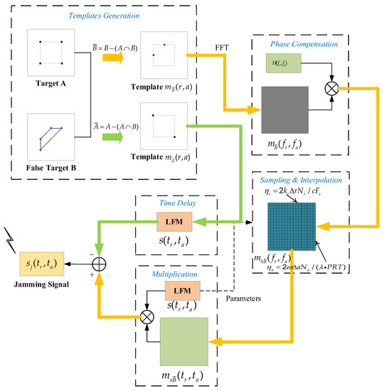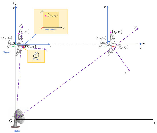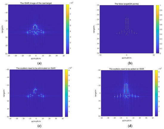 The deception jamming method based on Digital Radio Frequency Memory (DRFM) for Inverse Synthetic Aperture Radar (ISAR) has been a widely studied topic in recent decades. Typically, jamming signals generated using two-dimensional or three-dimensional false target models can create realistic false targets on the ISAR image. However, existing deception jamming methods cannot eliminate or revise the original echo, which can be retained by multiple anti-jamming methods once the radar judges out receiving the jamming signal. Additionally, these methods require large storage space for the models. Otherwise, the false targets cannot be generated realistically. To address these issues, this paper proposes a jamming signal generation algorithm based on two-dimensional template multiplication modulation and template time delay. The frequency shift and time delay relationship between the signals intercepted by the jammer and the real target echo is analyzed and derived in detail. With the use of these detailed derivations, it is possible to add and remove scatters by precisely locating the false scatter on the real ISAR image. The real target’s shape naturally changes as a result of the addition and removal of scatters. Furthermore, this method can adaptively change the resolution of the false target’s ISAR image with the radar pulse width and the accumulated pulse number. Meanwhile, the false target size on the ISAR image can be adjusted adaptively by altering the false template resolution. These features of the proposed method offer increased flexibility and efficiency for deception jamming. By accurately determining the position of false scatter on the ISAR image, this method offers improved performance compared with the existing techniques. Simulation results demonstrate the effectiveness of the proposed deception jamming method.