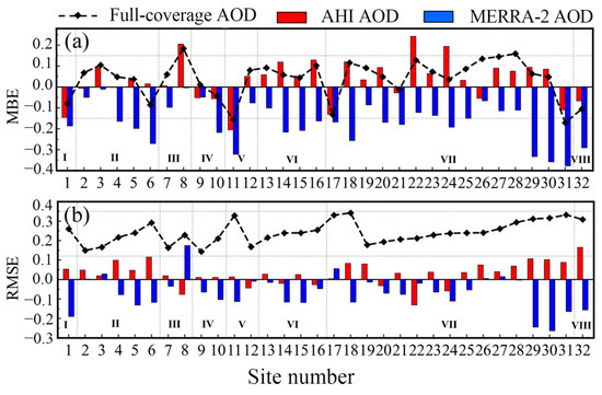 Aerosol Optical Depth (AOD) is a crucial physical parameter used to measure the radiative and scattering properties of the atmosphere. Obtaining full-coverage AOD measurements is essential for a thorough understanding of its impact on climate and air quality. However, satellite-based AOD products can be affected by abnormal weather conditions and high reflectance surfaces, leading to gaps in spatial coverage. To address this issue, we propose a satellite-based AOD filling method based on hourly level-3 Himawari-8 AOD products. In this study, the optimal model with a mean bias error (MBE) less than 0.01 and a root-mean-square error (RMSE) less than 0.1 in most land cover types was selected to generate the full-coverage AOD. The generated full-coverage AOD was validated against in situ measurements from the AERONET sites and compared with the performance of Himawari-8 AOD and MERRA-2 AOD over the AERONET sites. The validation results indicate that the accuracy of full-coverage AOD is comparable to that of the Advanced Himawari Imager (AHI) AOD, and for other land cover types (excluding barren land), the accuracy of full-coverage AOD is superior to that of MERRA-2 AOD. To investigate the practical application of full-coverage AOD, we utilized it as an input parameter to perform radiative transfer simulations in northwestern and southern China. The validation results showed that the simulated at-sensor radiance based on full-coverage AOD was in good agreement with the at-sensor radiance observations from MODIS. These results indicate that complete and accurate measurements of AOD have considerable potential for application in the simulation of at-sensor radiance and other related topics.