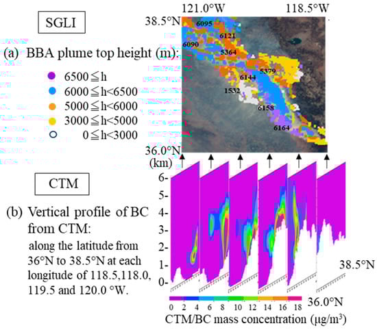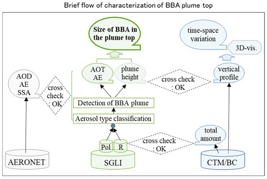 Biomass burning aerosols (BBA) released from large-scale wildfires pose a serious threat worldwide, necessitating a comprehensive understanding of their plume characteristics. To address this challenge, this study used satellite data provided by the Second-generation Global Imager (SGLI) aboard the Global Change Observation Mission-C and regional-scale numerical chemical transport model (CTM) simulations to characterize BBA plumes. The SGLI data and CTM simulations were compared and verified, and the 3D characteristics of BBA plumes, including concentration, diffusion range, spatial variation in optical properties, plume top height, and vertical profile, were subsequently derived. In this study, we focused on large-scale forest fires that occurred in western North America in September 2020 and Indonesia in September 2019. In both cases, Aerosol optical thickness (AOT) and Ångström Exponent (AE) values show a positive correlation with the height of the BBA plume top. The results showed that the higher the BBA plume top, the thicker the plume and the smaller the aerosol size. This point is what we particularly wish to highlight in this study. The SGLI polarization data proved useful for characterizing the upper layers of the BBA plumes. By understanding the detailed characteristics at the top of the plume, it is possible to predict the BBA plume’s advection and lifetime.