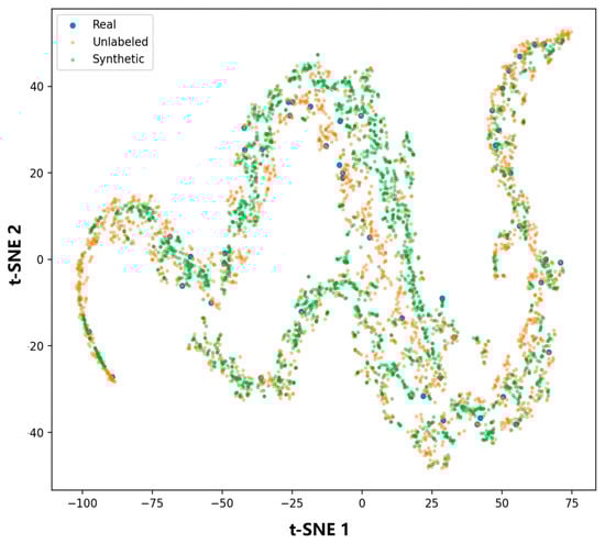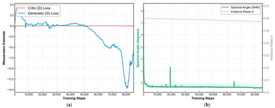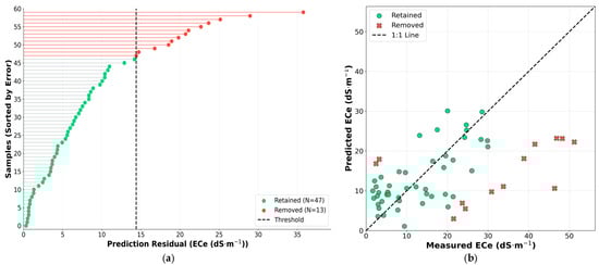 Soil salinity mapping in heterogeneous irrigation districts faces a dual challenge: the high dimensionality of hyperspectral data leads to redundancy, while the scarcity of ground-truth samples restricts the generalization of data-driven models. Traditional regression methods often struggle to capture non-linear spectral responses under such “small-sample” conditions. To address these limitations, this study proposes a semi-supervised retrieval framework coupling Optimal Band Combination Analysis (OBCA) with a Spectral Wasserstein GAN with Gradient Penalty (S-WGAN-GP). We constructed a robust feature set via cross-scenario evaluation and developed a rigorous “Uncertainty-Aware Filtering” protocol to screen synthetic samples generated by a teacher mechanism. The OBCA screening revealed that salinity-sensitive features are robustly clustered in the Green (550–570 nm) and Near-Infrared (NIR, 880–950 nm) regions, with NIR bands demonstrating superior stability across different sites. The proposed S-WGAN-GP successfully densified the feature manifold by generating 1186 high-fidelity synthetic samples. By incorporating these augmented data, the inversion accuracy was substantially improved: the R2 of the optimal SVR model increased from 0.36 (baseline) to 0.60 (+66.7%), and the RMSE decreased from 7.06 to 5.57 dSm−1. This study confirms that physically constrained generative augmentation, when combined with rigorous quality control, effectively bridges the distribution gap in limited datasets. The proposed framework offers a transferable and accurate solution for fine-scale soil salinity monitoring in data-scarce arid regions.