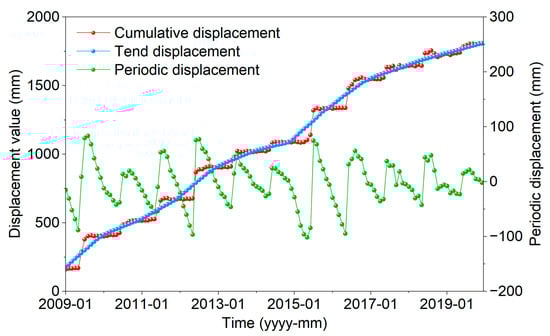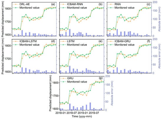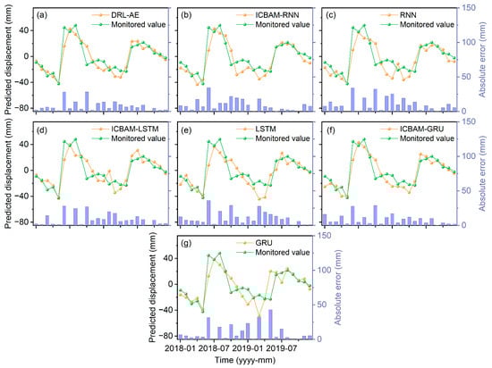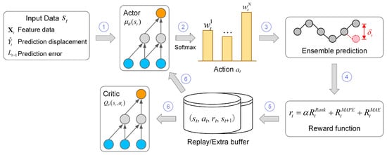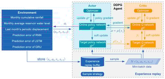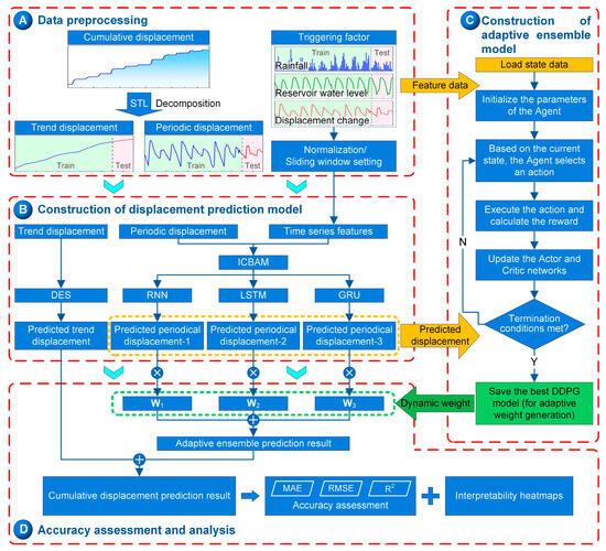 Accurate prediction of landslide displacement is crucial for hazard prevention. However, recurrent neural network (RNN) models have limitations in simultaneously capturing lag time and feature importance, and their black-box nature limits their interpretability. Moreover, the performance of single models varies across different deformation stages, especially during acceleration. To address these challenges, we propose an interpretable deep reinforcement learning-based adaptive ensemble (DRL-AE) framework. The method employs Seasonal and Trend decomposition using Loess to separate cumulative displacement into trend and periodic components. Trend and periodic sequences are predicted using double exponential smoothing and three RNN variants, respectively. An improved Convolutional Block Attention Module (ICBAM) enhances periodic feature extraction and provides temporal–spatial interpretability. The Deep Deterministic Policy Gradient algorithm adaptively integrates multi-model predictions in response to evolving environmental conditions. To validate the DRL-AE, a case study is conducted on the Baijiabao landslide in Zigui County, China. The results indicate that the DRL-AE substantially enhances prediction accuracy. For periodic displacement, it reduces MAE by 10.02% and RMSE by 6.65%, and increases R2 by 4.27% compared with the ICBAM-GRU model. The results also confirm the effectiveness of ICBAM in feature extraction, and the generated heatmaps provide intuitive interpretability of the relevant triggering factors.