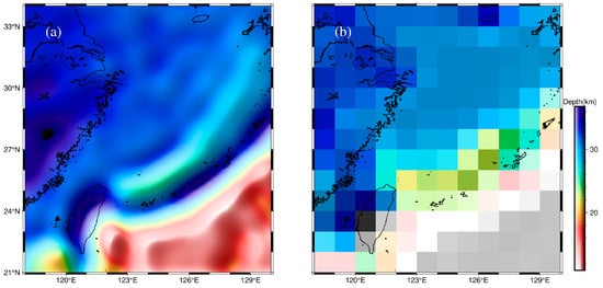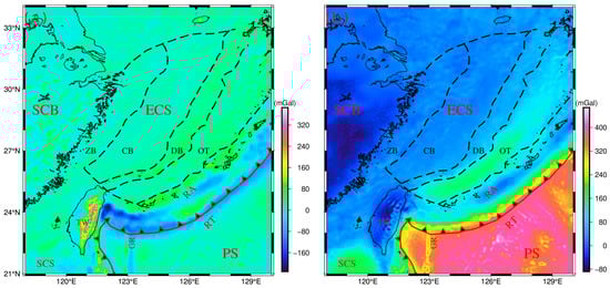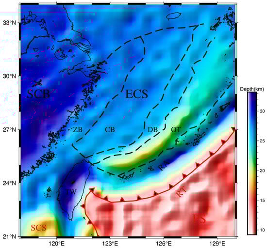 Moho fold structures provide critical insights into the tectonic evolution of the East China Sea. However, previous models exhibit substantial uncertainties, primarily resulting from the unaccounted gravitational effects of crustal sources and insufficient constraints on inversion parameters. In this study, we applied wavelet multi-scale analysis and the power spectrum method to remove crustal contributions, combined with an improved Bott’s method to achieve robust hyperparameter estimations. The Moho topographic model obtained through this method exhibits a significantly enhanced accuracy, with a root mean square deviation from seismic control points reduced by approximately 30% compared to other models. The resulting Moho fold structure reveals three key findings: (1) The South China Block has undergone vertical stress that forced the mantle to subduct. (2) In the northeastern and central parts of the Ryukyu Arc, vertical subduction forces are dominant. In the southwestern part of the Ryukyu Arc, vertical subduction forces are in balance with another force associated with mantle upwelling. (3) There is no interplate stress beneath the Okinawa Trough, and its crustal thinning may have been influenced by upwelling in the mantle.