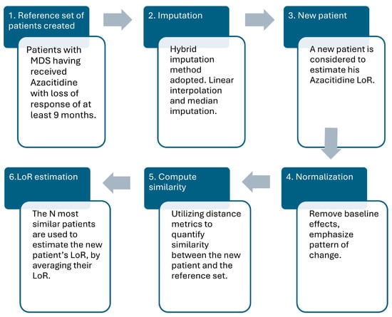 Azacytidine is the only approved treatment for patients with higher-risk myelodysplastic syndromes (MDS); yet less than half of the patients will achieve a response, whereas the duration of response is highly heterogeneous and there are no predictors for response duration. The aim of this study is to estimate the patient’s time to loss of response (LoR) to azacytidine based on clinical measurements during treatment. To this end, a personalized prediction framework is proposed that estimates the LoR of a new patient using a patient similarity-based approach. Namely, the new patient’s clinical data—represented as a multivariate time series—are compared to a reference set of patients. The comparison uses distance metrics that quantify how similar two patients’ time series are, assuming patients with similar trajectories tend to have similar LoR. Then, the LoR of the new patient is predicted by averaging the outcomes of the most similar reference patients. The pipeline includes a data normalization strategy that centers each feature on its baseline value and scales it to highlight relative changes and distance metrics to quantify similarity. Both real-world and simulated data were utilized to evaluate the proposed methodology, employing the leave-one-out validation and the Mean Absolute Percentage Error (MAPE) to assess accuracy. The estimated MAPE was found to be 30.52% and 11.82% in the real-world and simulated dataset, respectively. The best and most robust predictions were achieved using the Euclidean distance metric and setting the number of most similar patients around three to five. This study proposes a personalized predictive approach for the LoR to azacitidine in the MDS clinical setting, demonstrating potential for a serviceable prediction of LoR and forming the foundation for further research.